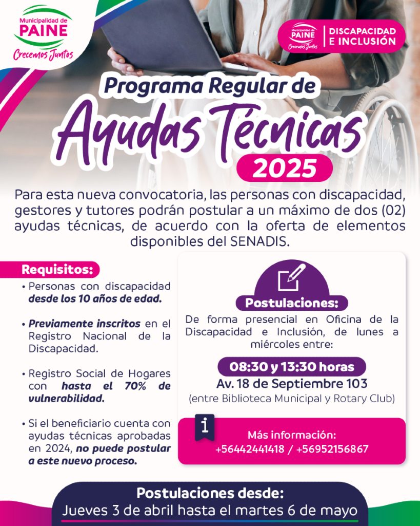 El Servicio Nacional de la Discapacidad (SENADIS) ha anunciado la apertura de postulaciones para el Programa Regular de Ayudas Técnicas 2025. Esta es una gran oportunidad para las personas con discapacidad que necesiten apoyo técnico para mejorar su calidad de vida.