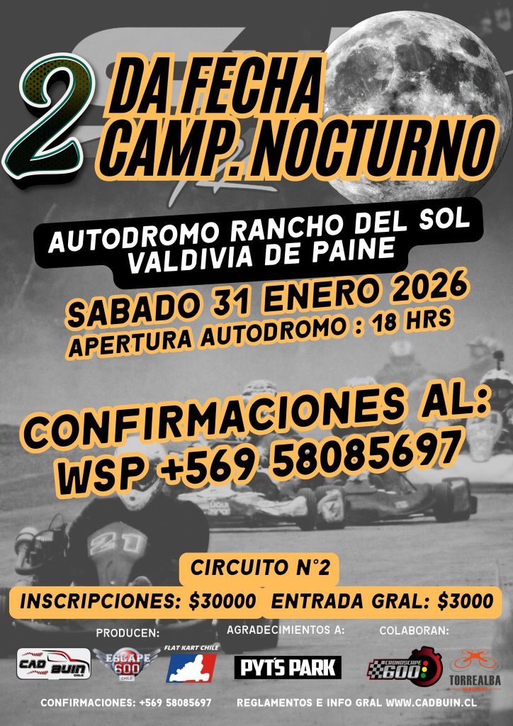 Este sábado 31 de enero de 2026, el Autódromo Rancho del Sol, ubicado en Valdivia de Paine, será el escenario de la segunda fecha del Campeonato Nocturno, un evento imperdible para los fanáticos del karting y el deporte tuerca.