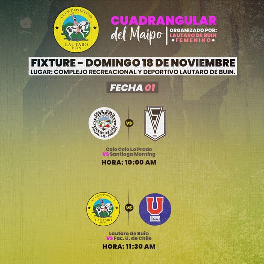 Cuadrangular Femenino Deja un comentario / Deportes / Por josto HOY COMIENZA EL CUADRANGULAR DEL MAIPO Hacemos un llamado a toda la familia Lautarina, que nos acompañen en este inicio de cuadrangular. Presentamos el fixture de la primera fecha. Colo Colo Lo Prado VS Santiago Morning HORA: 10:00 AM Lautaro de Buin Femenino VS Fac. U. de Chile HORA: 11:30 AM Los esperamos