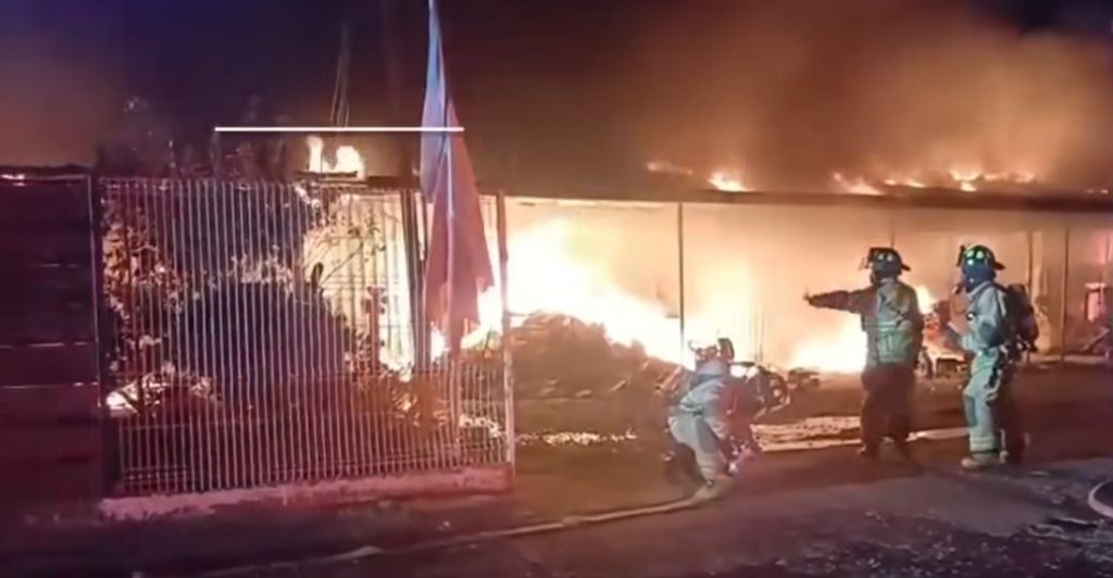 El siniestro comenzó pasada las 5:30 a.m. en una antigua casona habitacional, bomberos informó que el fuego se propagó hacia una bodega contigua en la que se almacenaban neumáticos y donde también funcionaba un taller automotriz, lo que complicó las labores de contención.