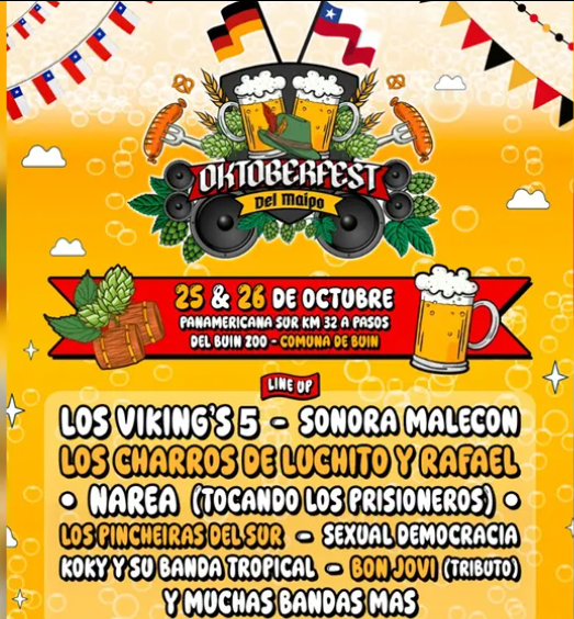 El Oktoberfest del Maipo se celebrará los días 25 y 26 de octubre en la Panamericana Sur, kilómetro 32, a pasos del Buin Zoo, prometiendo dos jornadas llenas de música, cultura y tradición alemana.